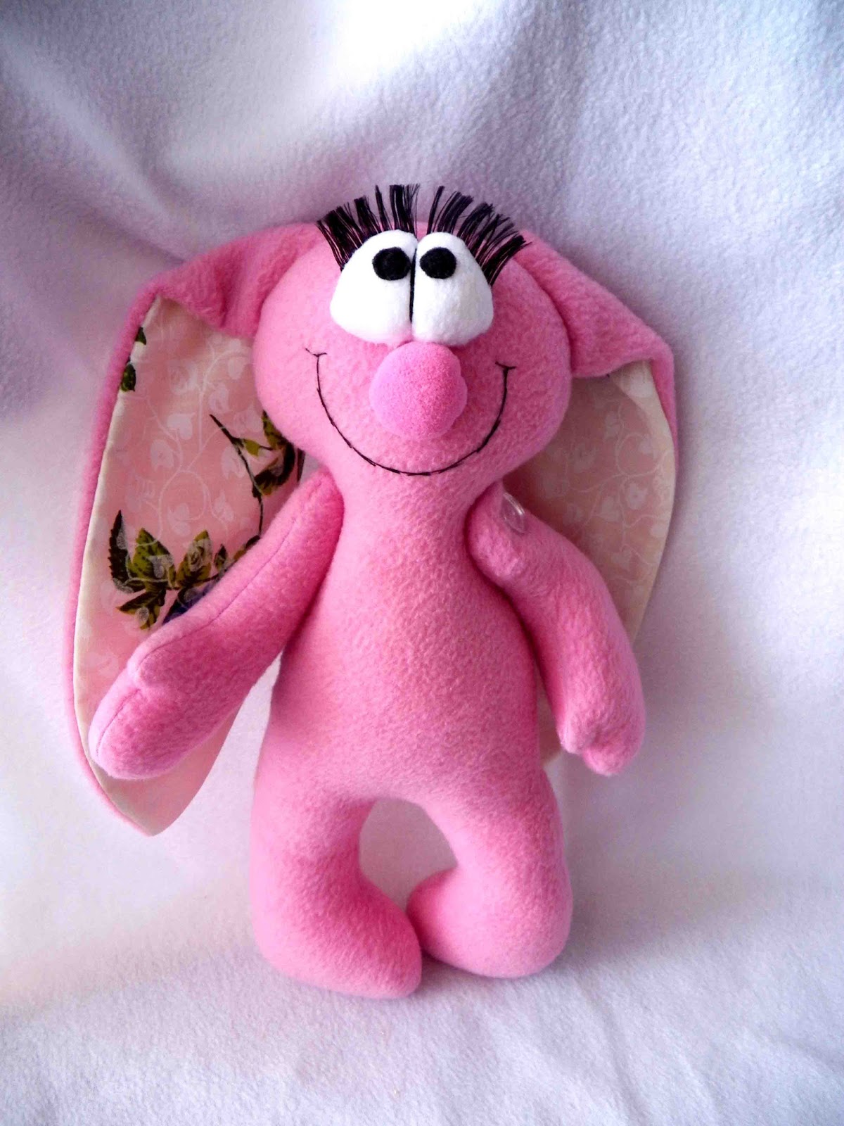 Проходит на одном форуме благотворительная аукцион в помощь мальчику. Мыло мне было лень делать, решила пошить зайкуткань надо же расходовать, пока она не вытеснила мои вещи из шкафа. Как раз и выкройку где-то давно нашла, чуток переделала и пошилось розовое, глазастое чудо. Назвала Заюней))) Зайка пошита из флиса, набита наполнителем из гипоаллергенного